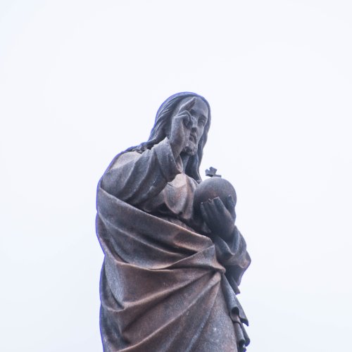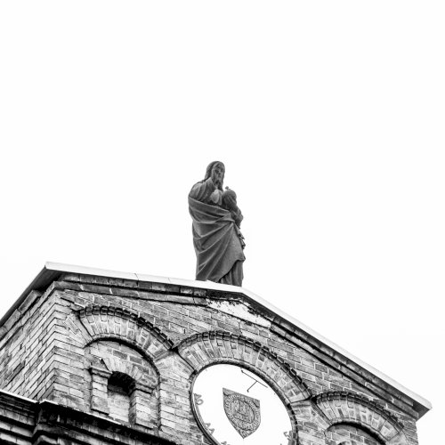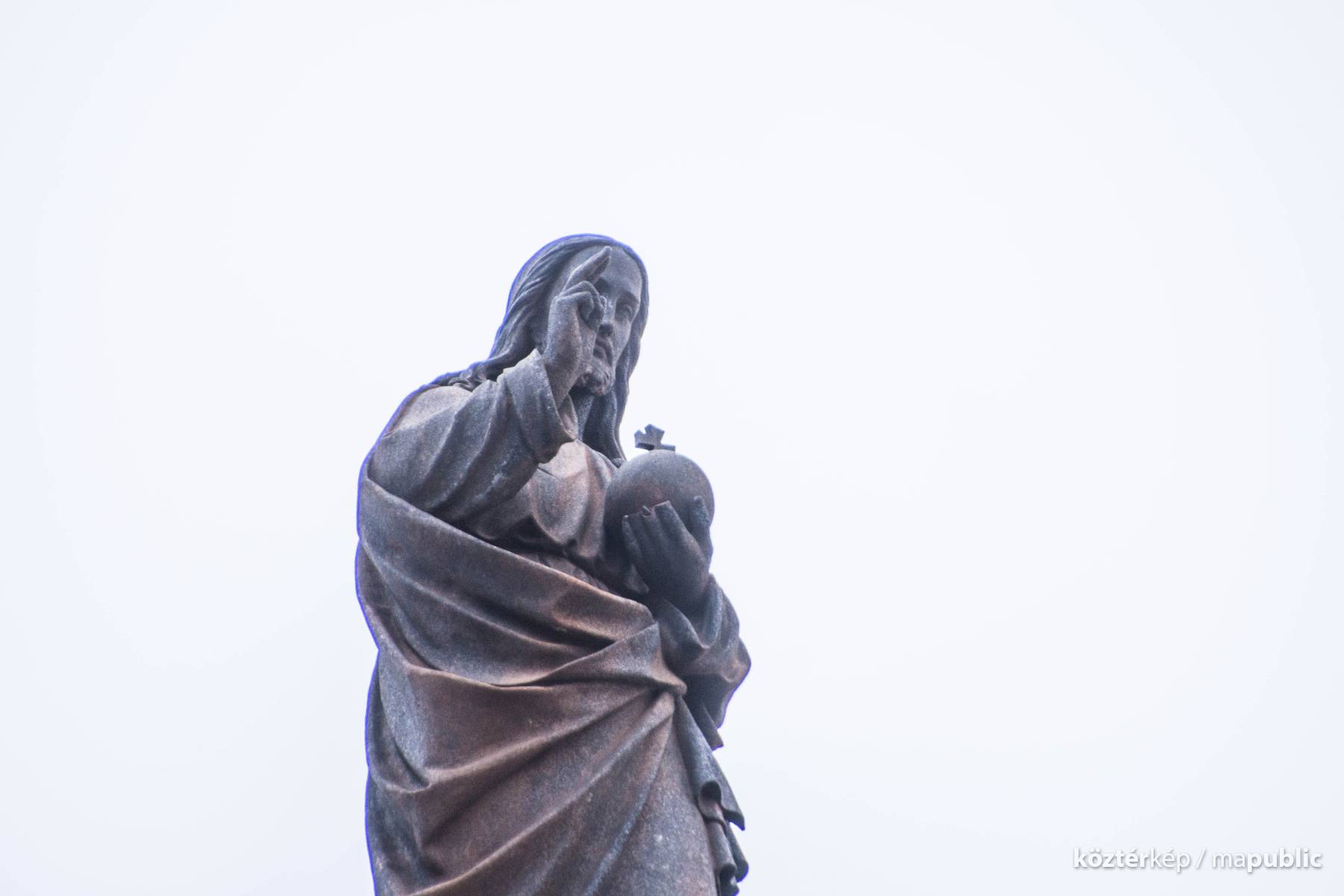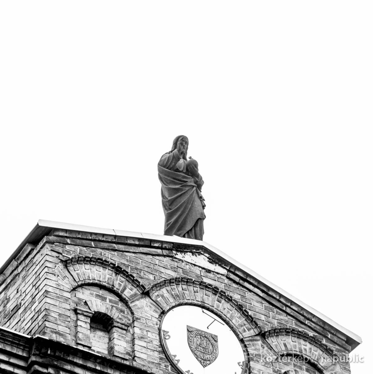 Az épület oromzatán Jézus Krisztus szobor áll.